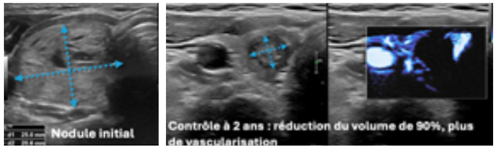 Il s’agit des traitements qui permettent de prendre en charge les nodules thyroïdiens bénins, qui deviennent symptomatiques ou grossissent régulièrement, sans avoir à enlever toute la thyroïde afin de conserver un fonctionnement normal de celle-ci, et d’éviter un traitement à vie.